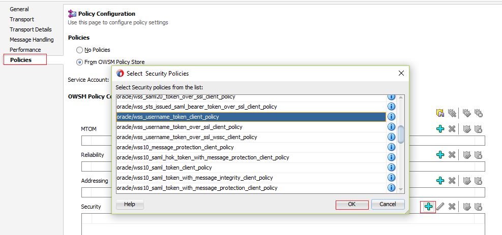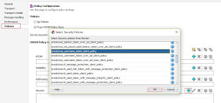 8) Open the Business Service, Move to the Policies tab, Choose the From OWSM Policy Store option, Click + sign from Security section and add oracle/wss_username_client_policy from the popup and click OK