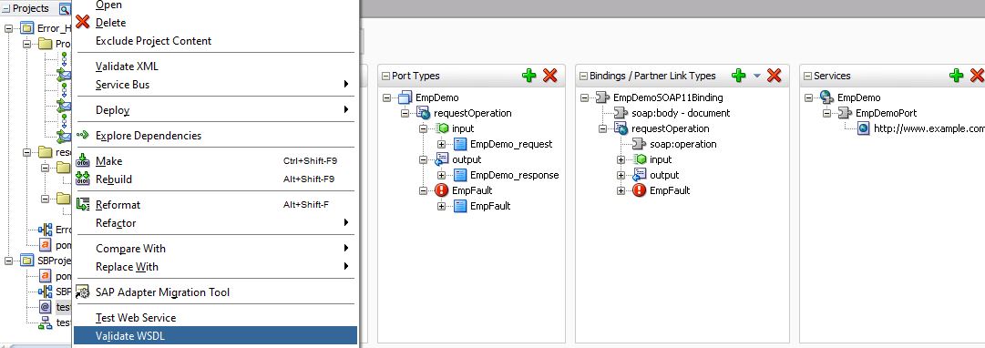 WSDL has been completed. Now validate the WSDL to see the WSDL we have created is valid or not. Right, Click on the test.wsdl and click Validate WSDL