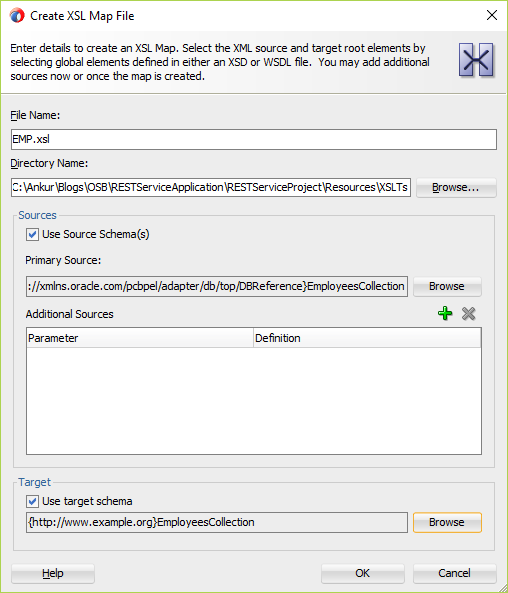 Select Browse button from Target section. Select Browse, Choose Employees.xsd and select EmployeesCollection element. Click OK twice.