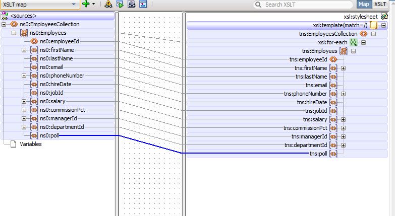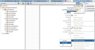 XSLT file will get open. Right click on the Employees from right panel, Add xslt instruction -> for each and wire the elements like below: