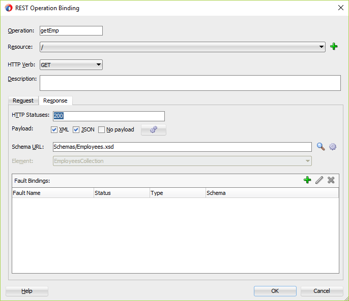 Click on Response tab, select XML and JSON checkbox both and click on browse from schema file icon, select choose Employees.xsd -> EmployeesCollection and Click OK