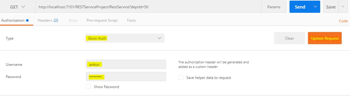 Add the Basic Auth in POSTMAN, enter User Name and Password you created in Weblogic console and click Update Request button