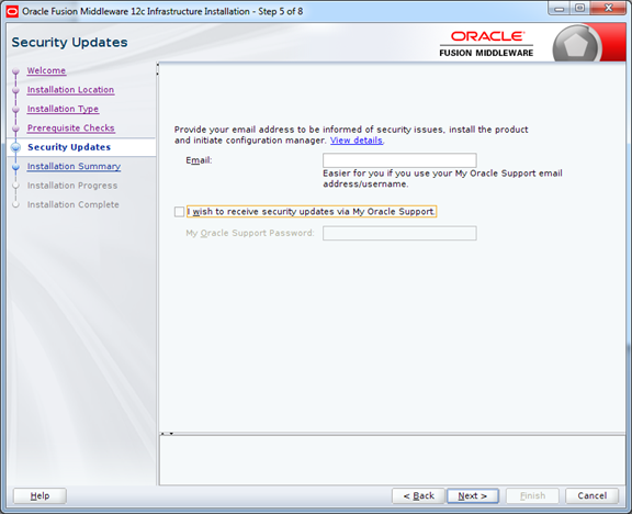 9) The Configure Security Updates window appears. Enter your email address and My Oracle Support password to receive security issue notifications via email. If you do not wish to receive notifications via email, deselect “I wish to receive security updates via My Oracle Support“. Click Next to continue. Click “Yes” in the confirmation window to confirm your preference.