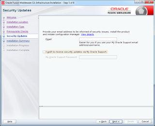 In this blog , it is assumed you select the Fusion Middleware infrastructure type, which installs the Oracle WebLogic. However you can choose different option as well. Click Next