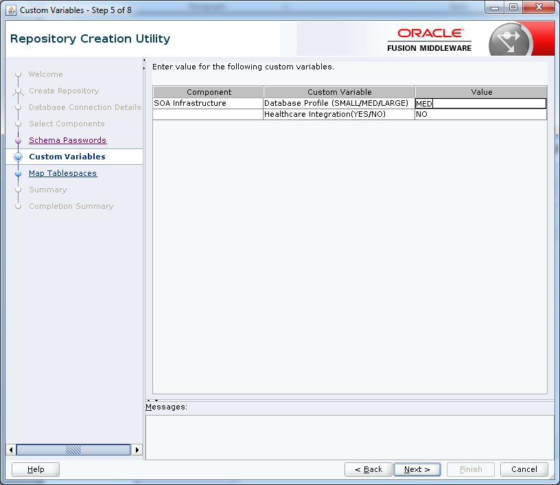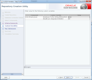 10) Specify the custom variables for the SOA Infrastructure schema. For the Oracle Service Bus standard installation topology, accept both default values for the Database Profile (SMALL) and Healthcare Integration (NO). But we have changed Database Profile value to MED as per the requirement.