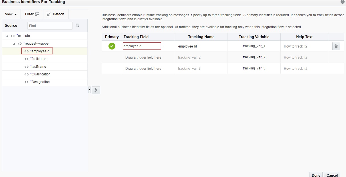 - Drag & Drop the employeeId from left panel to first row in Tracking Field and click Done button