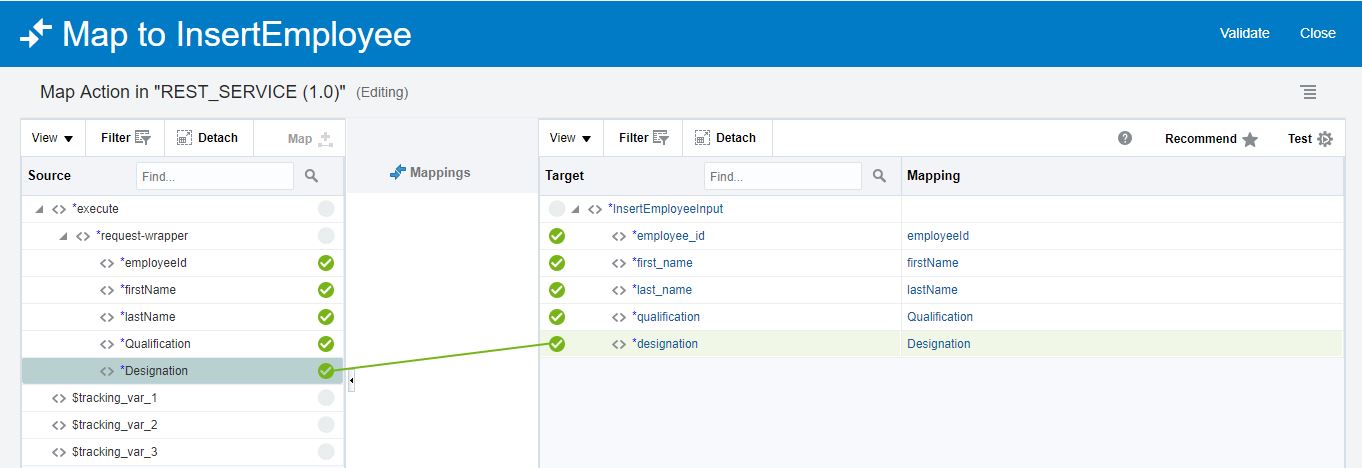 - Map the source and target field as shown in the below scree shot. Click Validate and Close button