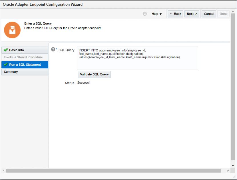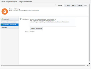 - Enter below insert query in SQL query box and Click Validate SQL query to validate the entered query and Click Next button