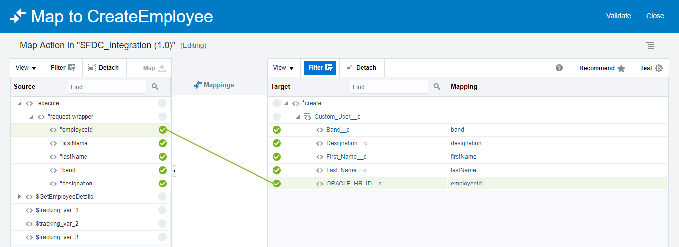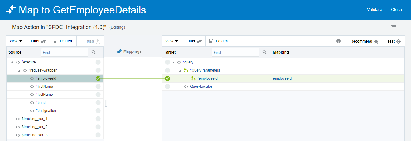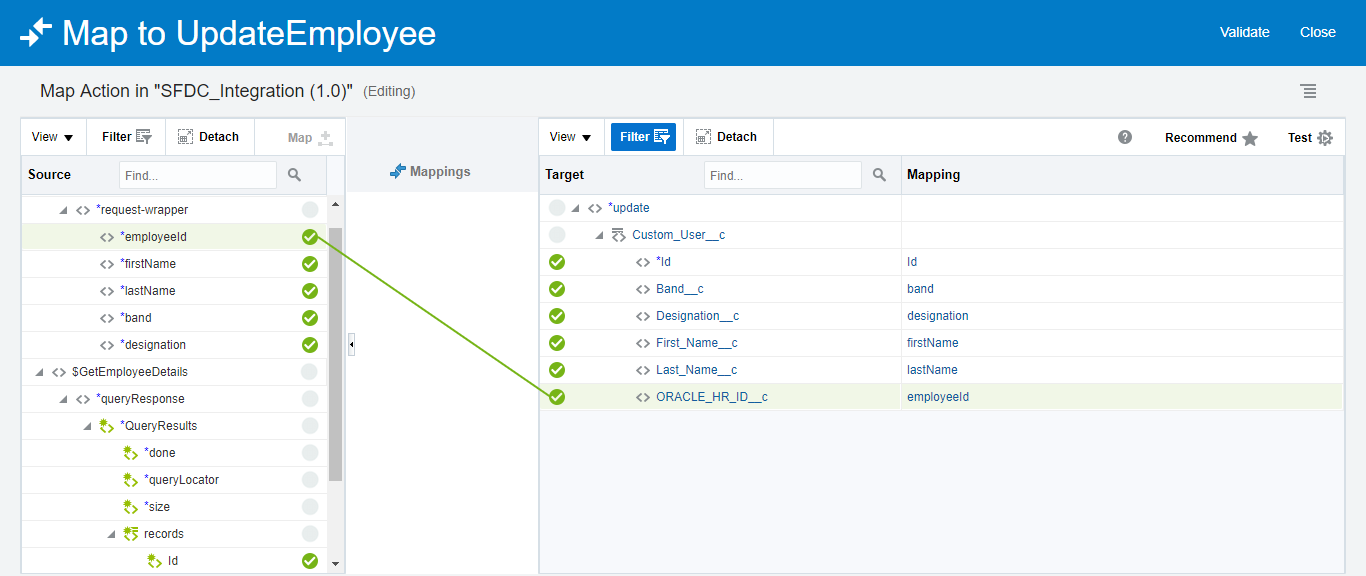 • Map employeeId to employeeId as shown in the below screenshot. Click the Validate and Close button