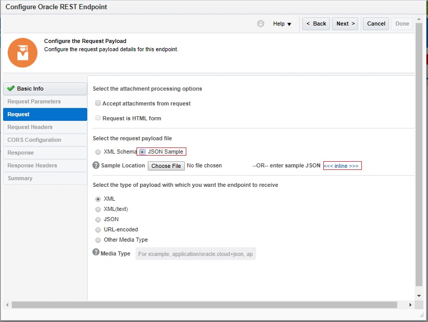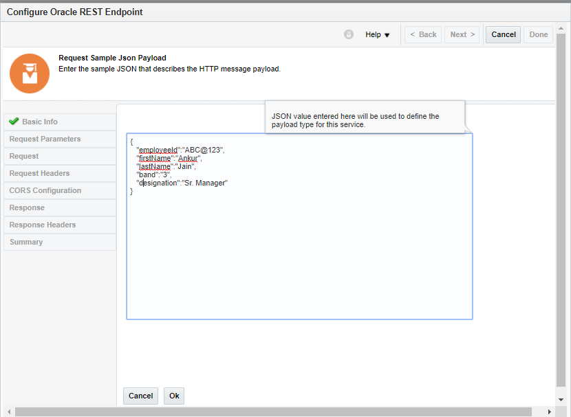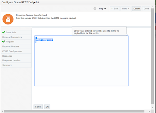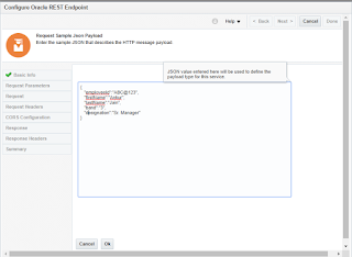 • Select JSON Sample Radio button: This option allows us to take input in JSON format. Select inline link to give sample payload