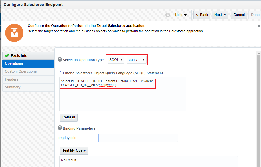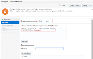 • Enter below SOQL query. Custom_User__C is the Salesforce custom object which is used to store employee details. Id is the unique id of each record generated by Salesforce on new record inserted. Oracle_HR_ID__C is the field which is used to store employee id.