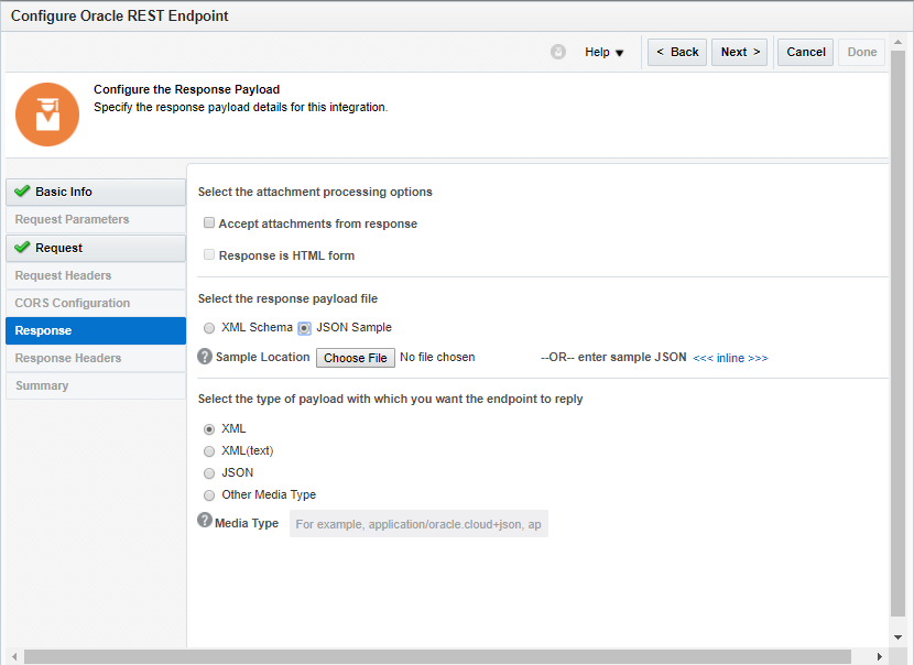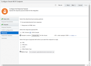 • Below step allows us to configure sample response payload. Select JSON radio button and click inline link