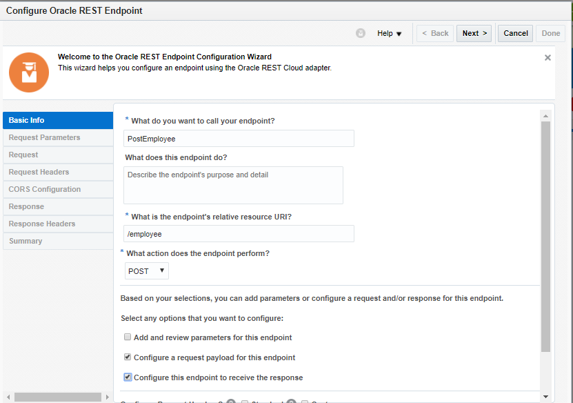• Select Configure a request payload for this endpoint checkbox- This option allows us to assign sample request payload in the next step