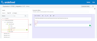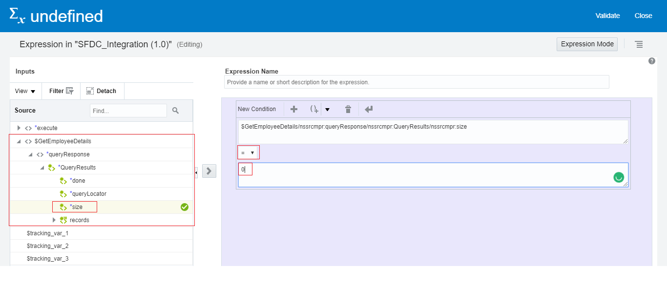 • Expand $GetEmployeeDetails -> queryResponse -> QueryResults and drop size parameter to New condition input box. Enter 0 as the value. It means, if the employee will not exist in the Salesforce, the value of size will be 0. Click the Validate button and Close