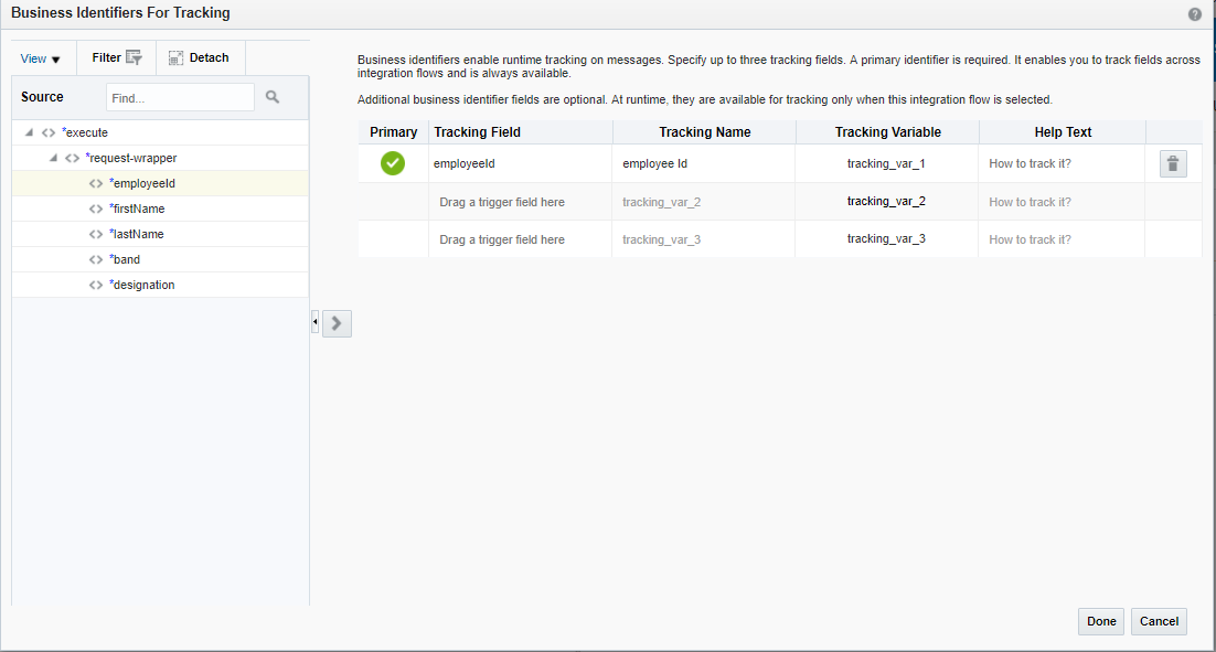 • Expose a REST service(Source) that takes five input parameters(first name, last name, designation, employee id, and band)
