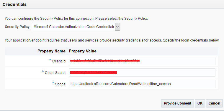 - Security Policy: Select Microsoft Calendar Authorization Code Credentials