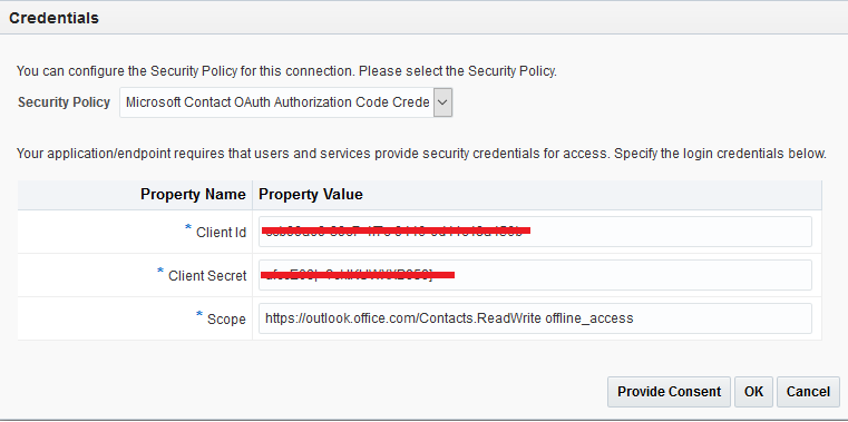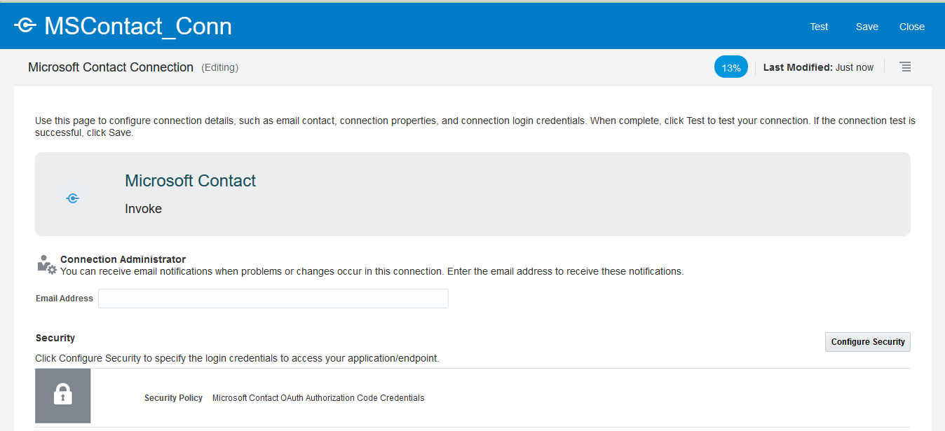 - Security Policy: Select Microsoft Contact OAuth Authorization Code Credentials