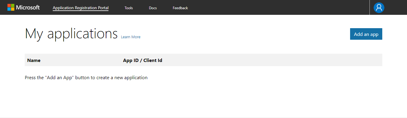 - Open browser and navigate to the https://apps.dev.microsoft.com/