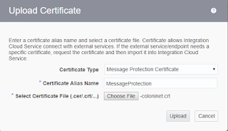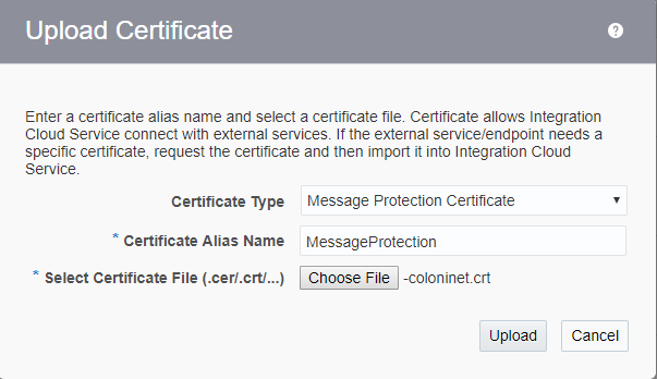 - Message Protection Certificate: Use this option to upload a keystore certificate with SAML token support. Create, read, update, and delete (CRUD) operations are supported on this type of certificate