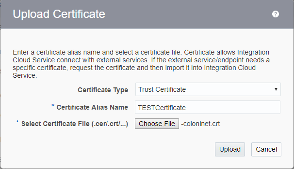 A certificate enables Oracle Integration Cloud Service to connect with external services. If the external endpoint requires a specific certificate, request the certificate and then upload it into Oracle Integration Cloud Service.