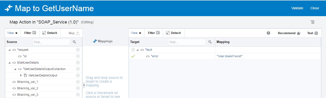 - Edit the newly added mapper and you will notice that fault object that was in the WSDL will be shown automatically. Put the expression ‘User doesn’t exist‘ in the reason