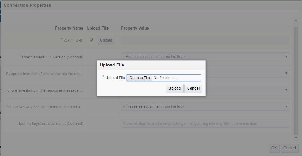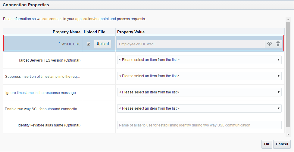 • From the opened Connection properties dialog box, select the checkbox corresponding to WSDL URL and upload the WSDL