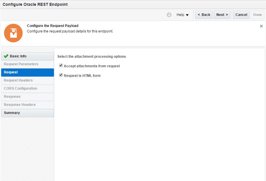 • Select Accept attachments from request and Request in HTML form checkboxes then click Next and Done button