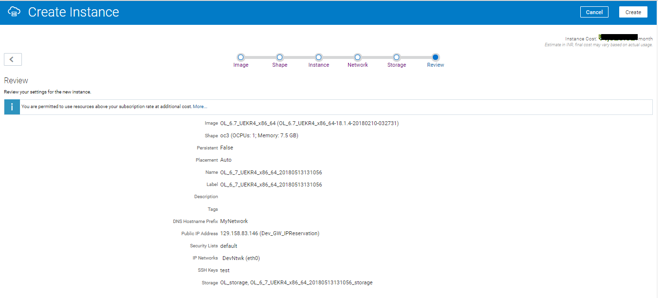 - Public IP Address: We can select an available public IP address for this interface. When the instance is created, we can configure security rules and access control lists for your IP network to enable access to this IP address over the public Internet. If we don’t select an IP reservation now, we can associate a public IP address with this interface later by creating or updating an IP reservation. Let’s leave this field blank for now