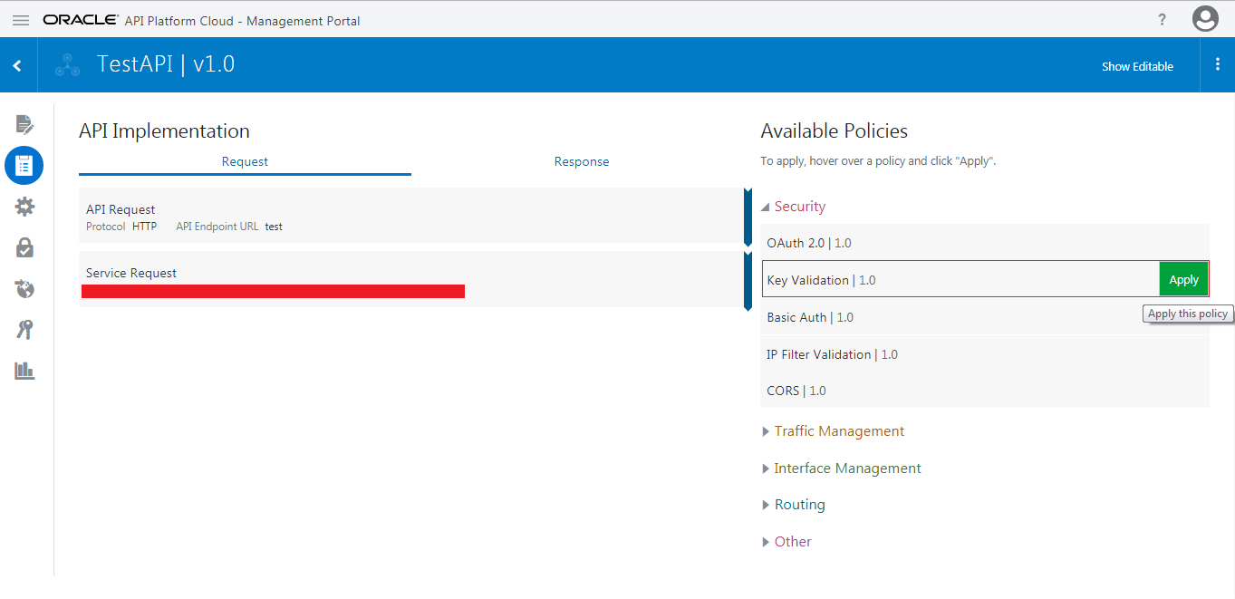 - In the Available Policies region, expand Security, hover over Key Validation, and then click Apply