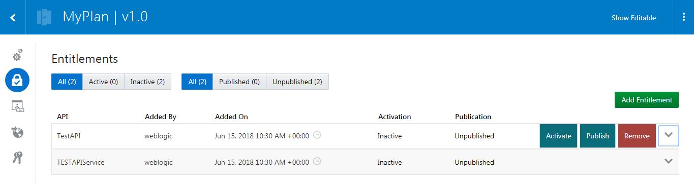 Note:  Publishing an entitlement makes it available to application developers in the Developer Portal and a plan must be active for it to be available for use.