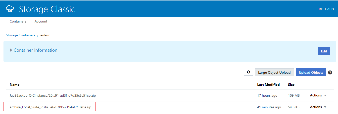 “archiveFile”:”archive_Local_Suite_Instance-ee041ff3-7659-4d2c-80e4-fbe47377448e.zip”,”importActivateMode”:”ImportActivate”,”storageInfo”:{“storageUrl”:”https://storage.us.storage.oraclecloud.com/v1/Storage-storage/ankur”,”storageUser”:”example@gmail.com”,”storagePassword”:”example@1234″}}’