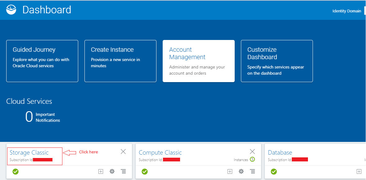 Let’s create the container if not exist already. Before we create a container let’s identify the Storage URL which will be used in the next step to save the exported archive file. To see the Storage URL, login into the Oracle Cloud my services and navigate to the Dashboard. Click on the Storage Classic (if not found, customized the dashboard screen using Customize Dashboard tile)