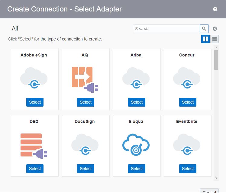 Oracle Integration Cloud Service includes a set of predefined adapters, which are the types of applications on which you can base your connections, such as Oracle Sales Cloud, E-business suite, SOAP, REST, and others.