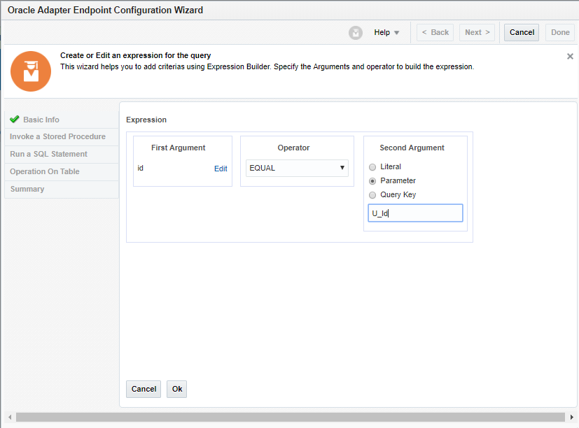 - Second Argument: Select Parameter radio and enter U_Id in the input box