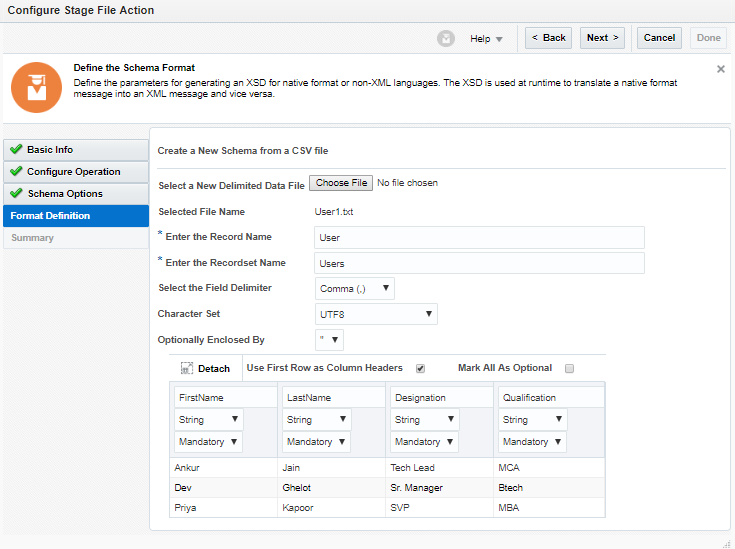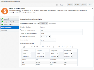 - Create a sample CSV file and paste the content as below and upload using the Choose File button. Enter User and Users in the subsequent text boxes and click the Next button