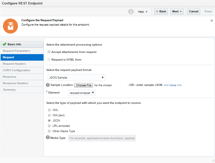 • Select JSON Sample from the request payload format drop-down, click <<inline>> link and enter below sample JSON payload