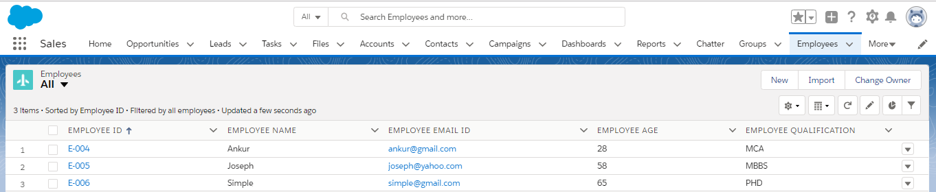 • Open the SFDC custom Object Employee__c and see the requested data should be inserted into the Object