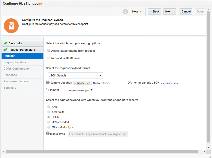- Select JSON Sample from the request payload format drop-down, click << inline >> link and enter below sample JSON payload
