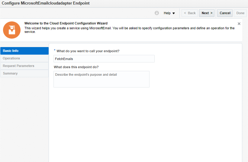 - Drop the Microsoft Email adapter again under For Each loop. The configuration wizard will be opened. On the very first screen enter below information and click the Next button
