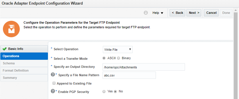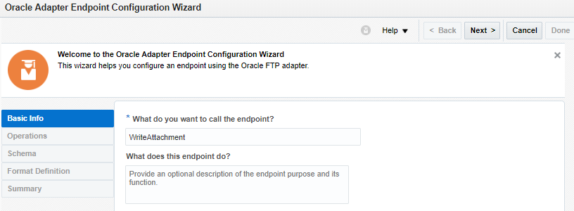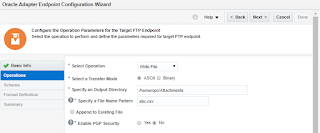 - Now, drop the FTP adapter inside the inner “For Each” loop. The configuration wizard will be opened. On the very first screen enter below information and click the Next button