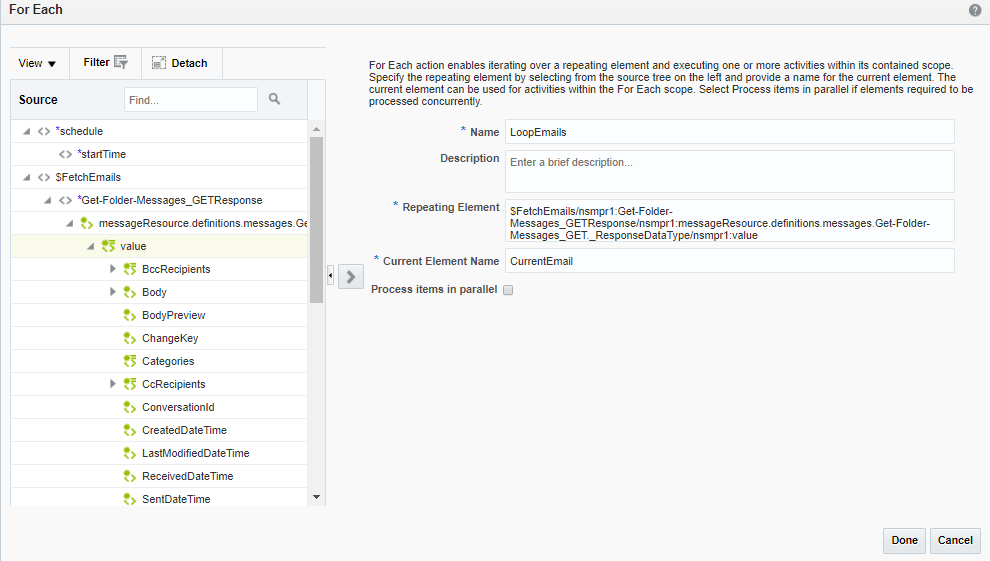 - Repeating Element: Drop the “value” element of the $FetchEmails node