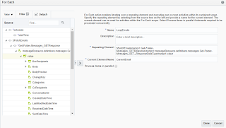 - Drop the “For Each” activity just below the MS email adapter and configure the below options in the opened wizard of “For Each” activity
