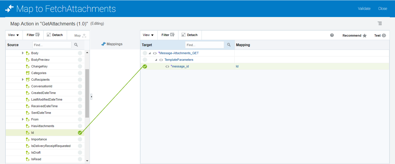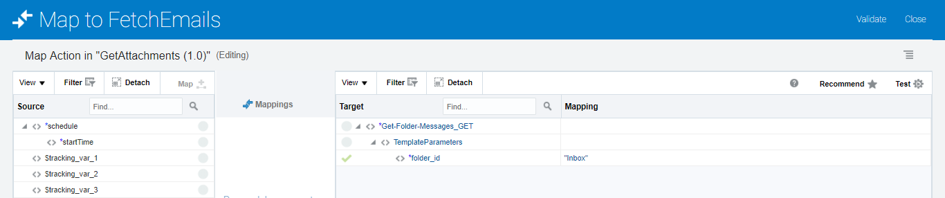 - Edit the “FetchAttachments” mapper and drop the “id” element under the “$CurrentEmail” node to the “message_id” template parameter