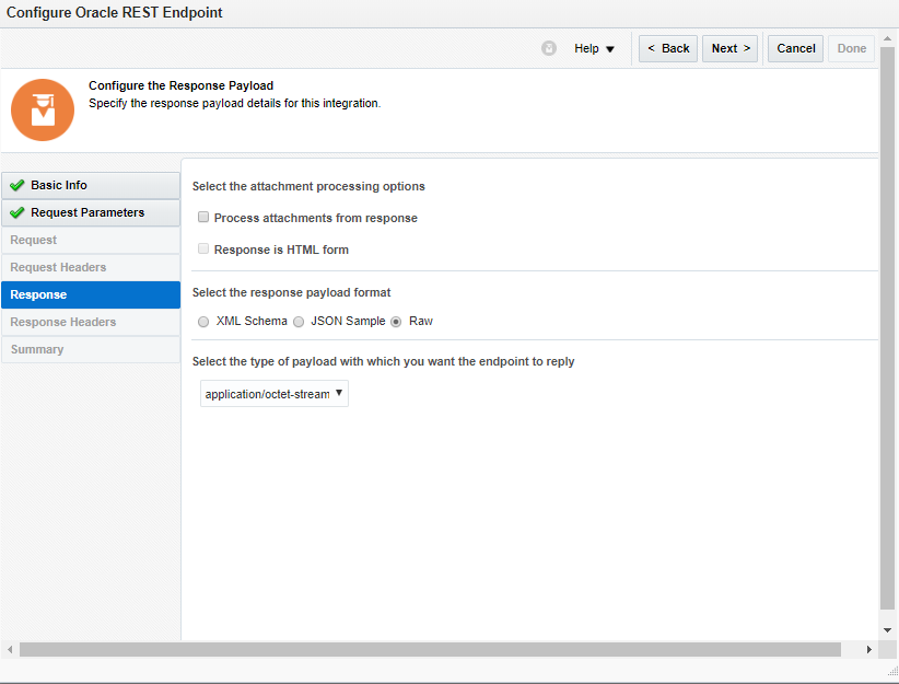 - Select Raw Radio button of the Select the response payload format. Click the Next button and finish the wizard