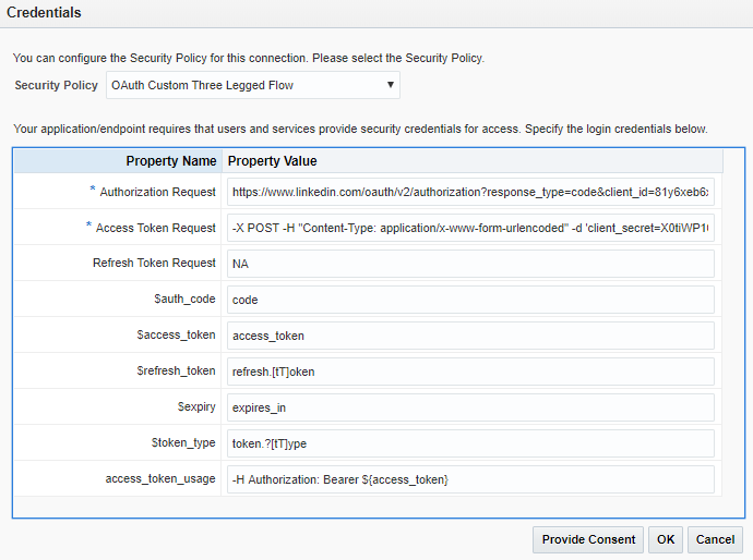 -X POST -H “Content-Type: application/x-www-form-urlencoded” -d ‘client_secret=X0tiWP105Utde7iZ&grant_type=authorization_code&redirect_uri=https%3A%2F%2Ficsinstance-a1111.integration.us2.oraclecloud.com%3A443%2Ficsapis%2Fagent%2Foauth%2Fcallback&client_id=81y6xeb6x8kqyw&code=${auth_code}’ “https://www.linkedin.com/oauth/v2/accessToken”